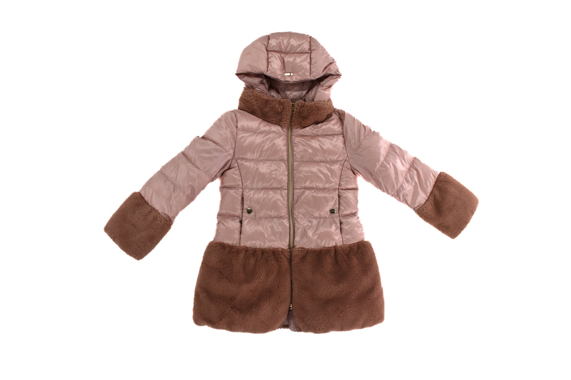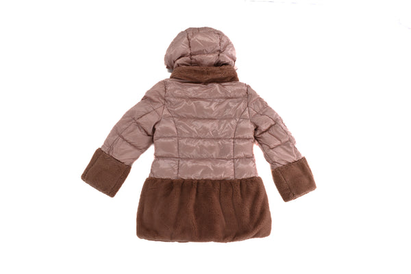• With pink faux fur at hem, cuffs & neck