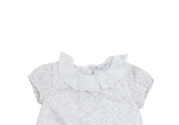 • Summer pink floral romper with embroidered white frill collar.
